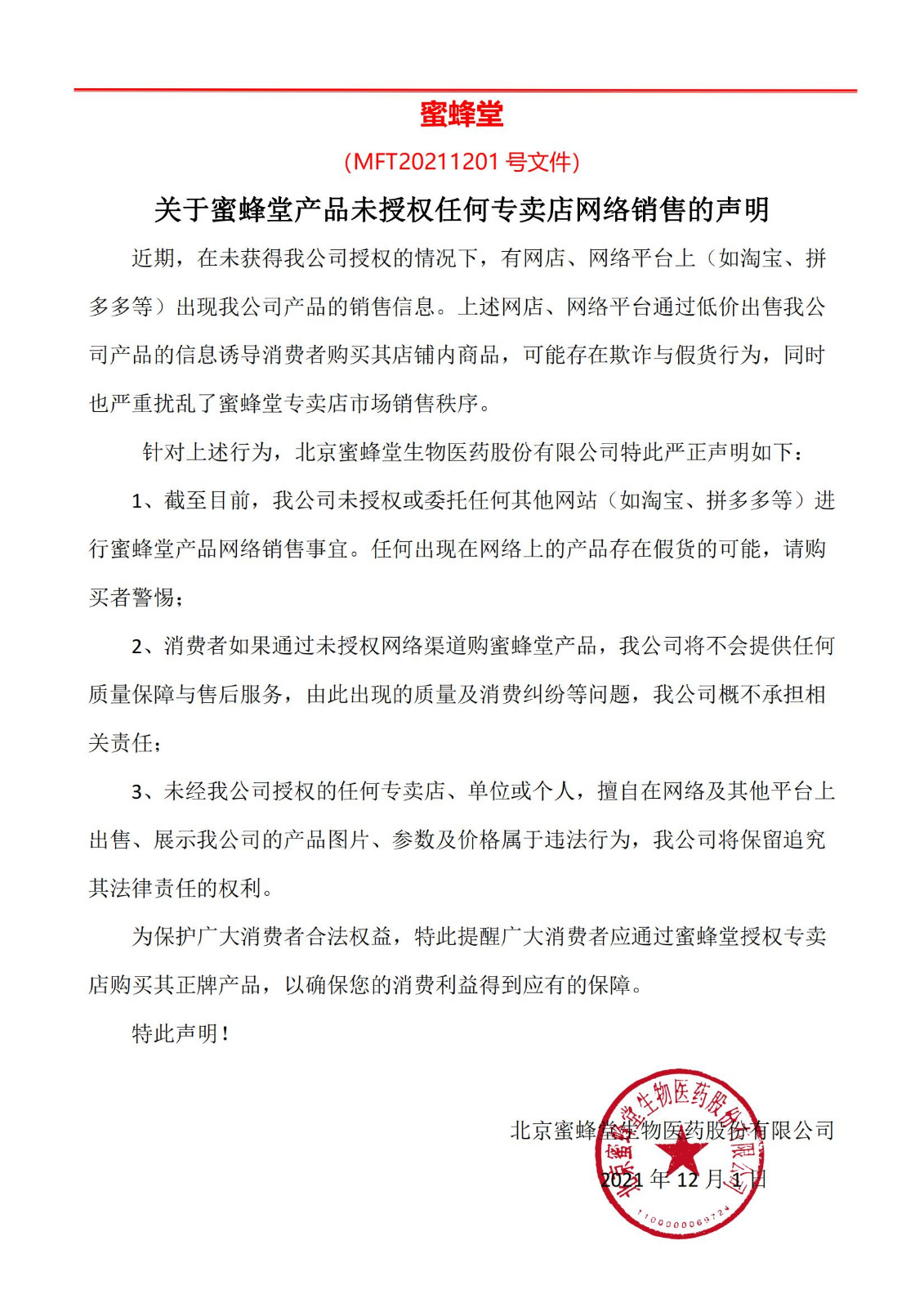關(guān)于蜜蜂堂產(chǎn)品未授權(quán)任何專(zhuān)賣(mài)店網(wǎng)絡(luò)銷(xiāo)售的聲明