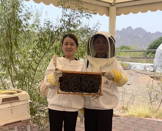 蜜蜂堂集團(tuán)副總?cè)舞磋磁c外貿(mào)部銷售經(jīng)理在迪拜DUBAI HATTA HONEY養(yǎng)蜂場(chǎng)